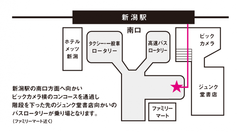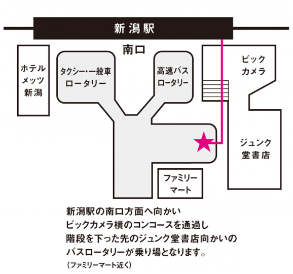 | 無料送迎バス | 新潟駅南口から無料送迎バスのご用意がございます。 所要時間 約50分